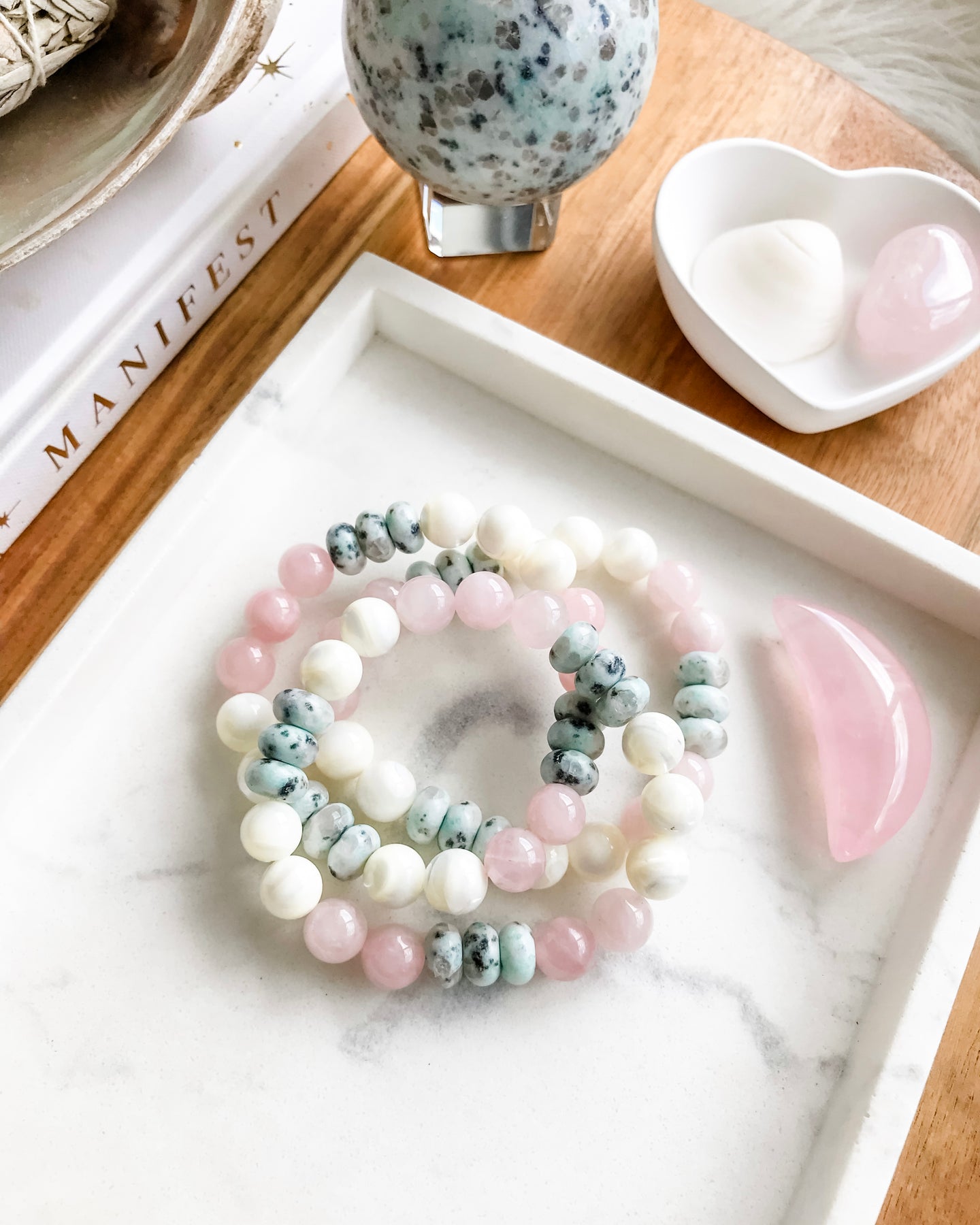 The MOONLIT SERENITY mala bracelet is a mystical blend of Rose Quartz, Kiwi Jasper, and Mother of Pearl beads, woven together to bring balance and harmony to you. Rose Quartz ignites heart-centred love and self-care, while Kiwi Jasper grounds and protects your aura. Mother of Pearl adds a touch of ocean magic, amplifying intuition and emotional flow.