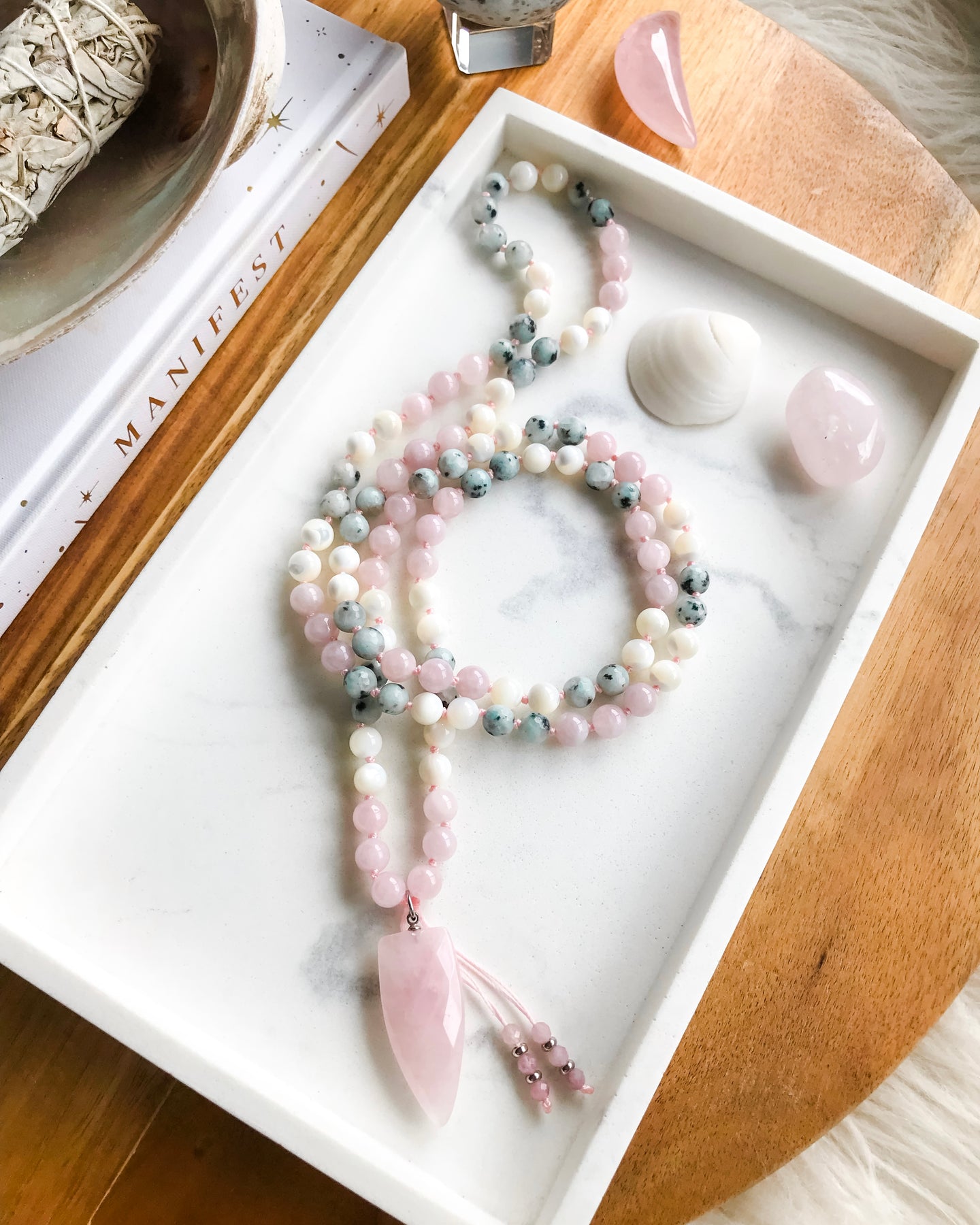 This 108-bead mala necklace is a talisman for the wild-hearted and moon-guided. Luminous mother of pearl beads glow with ocean-born wisdom, inviting calm, intuition, and divine feminine energy. Earthy kiwi jasper weaves in grounding magic - steadying your spirit while keeping your heart open to possibility. Blush-toned rose quartz beads whisper unconditional love, self-devotion, and gentle healing with every breath and mantra.